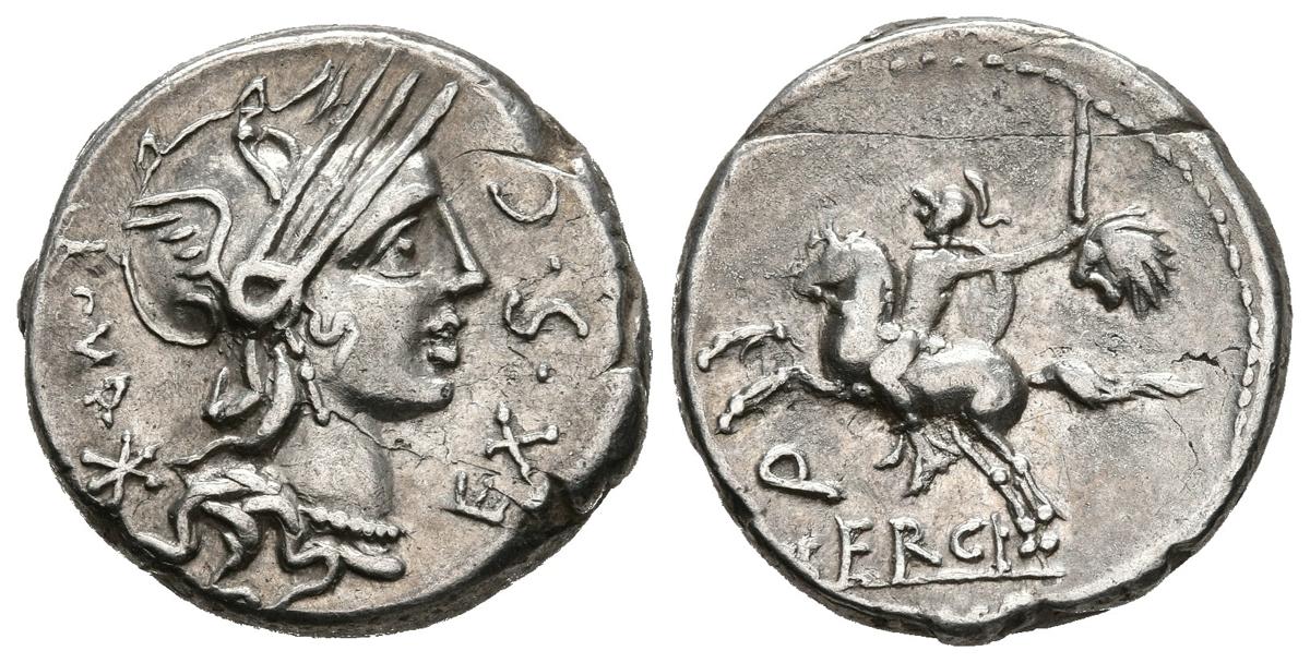GENS SERGIA. Denario. (Ar. 3,93g/17mm). 116-115 a.C. Norte de Italia. (FFC 1111; Crawford 286/1). Anv: Cabeza de Roma a derecha, detrás estrella, detrás: ROMA, delante: EX SC. Rev: Jinete con espada a izquierda en el campo cabeza de galo, debajo leyenda: Q M SERGI, en exergo: SILVS. MBC+.