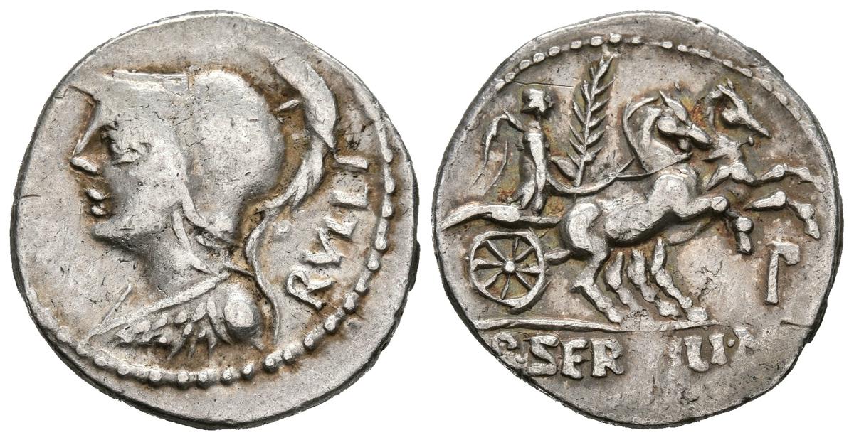 GENS SERVILIA. Denario. (Ar. 3,94g/20mm). 100 a.C. Norte de Italia. (FFC 1118; Crawford 328/1). Anv: Cabeza de Minerva a izquierda, detrás leyenda: RVLLI. Rev: Victoria con palma en biga a derecha, en exergo: P SERVILI MF, debajo letra. MBC.