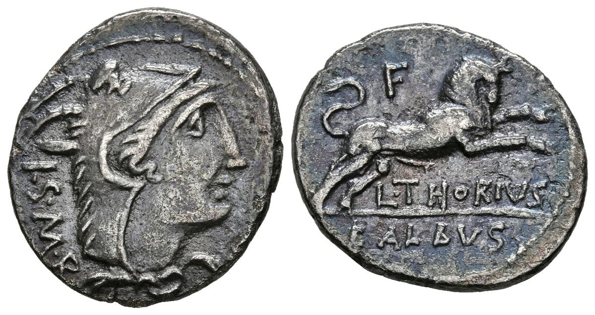 GENS THORIA. Denario. (Ar. 3,40g/19mm). 105 a.C. Norte de Italia. (FFC 1141; Crawford 3161). Anv: Cabeza de Juno Sospita a derecha encubierta con piel de cabra, detrás ISMR. Rev: Toro a derecha, encima letra: F, debajo leyenda: THORIVS, en exergo: BALBVS. MBC.
