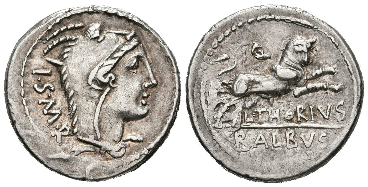GENS THORIA. Denario. (Ar. 3,86g/21mm). 105 a.C. Norte de Italia. (FFC 1141; Crawford 3161). Anv: Cabeza de Juno Sospita a derecha encubierta con piel de cabra, detrás ISMR. Rev: Toro a derecha, encima letra: Q, debajo leyenda: THORIVS, en exergo: BALBVS. MBC.