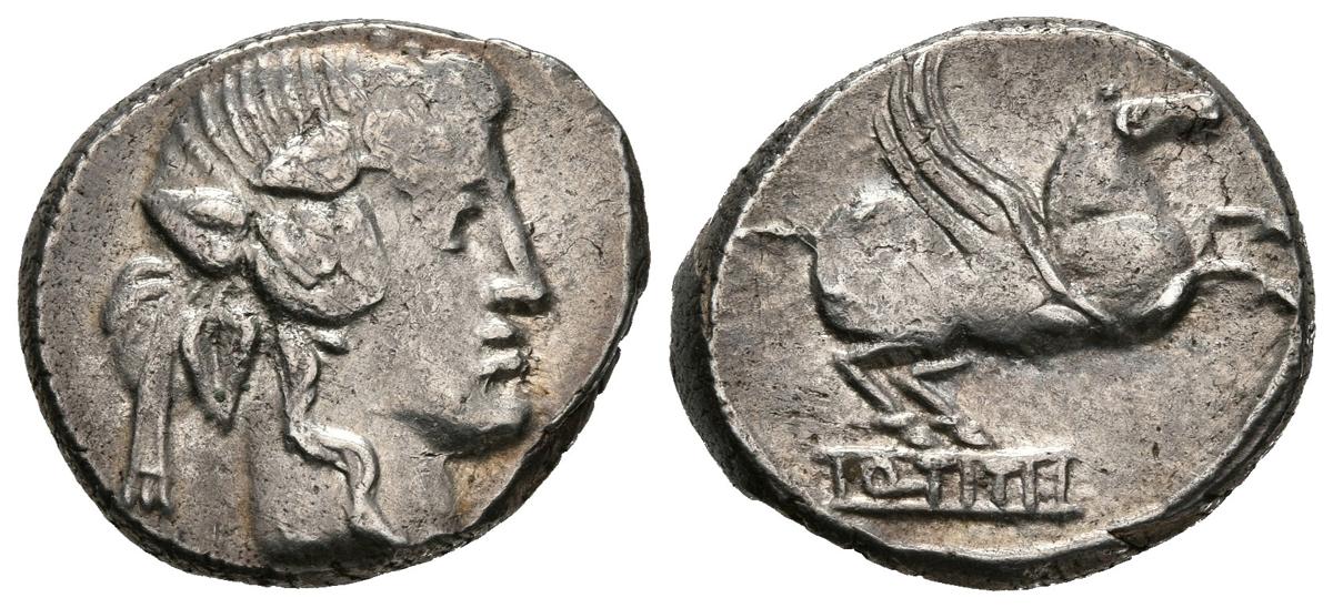 GENS TITIA. Denario. (Ar. 4,17g/18mm). 90 a.C. Italia Central. (FFC 1143; Crawford 341/2). Anv: Cabeza del Baco joven a derecha. Rev: Pegaso a derecha, debajo leyenda: Q TITI dentro de tablilla. MBC+.