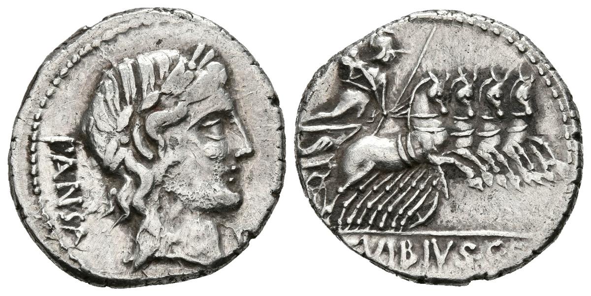 GENS VIBIA. Denario. (Ar. 4,03g/18mm). 90 a.C. Taller auxiliar de Roma. (FFC 1194; Crawford 342/5b). Anv: Cabeza de Apolo a derecha, delante símbolo, detrás leyenda: PANSA. Rev: Minerva en cuádriga a derecha con cetro y trofeo, en exergo: C VIBIVS C F. MBC.