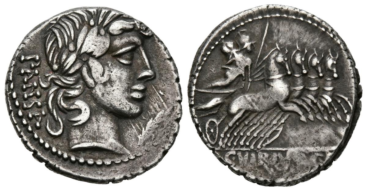 GENS VIBIA. Denario. (Ar. 3,96g/19mm). 90 a.C. Taller auxiliar de Roma. (FFC 1201; Crawford 342/5b). Anv: Cabeza laureada de Apolo a derecha con rizos en la nuca, delante símbolo, detrás leyenda: PANSA. Rev: Minerva en cuádriga a derecha con cetro y trofeo, en exergo: C VIBIVS C F. MBC.