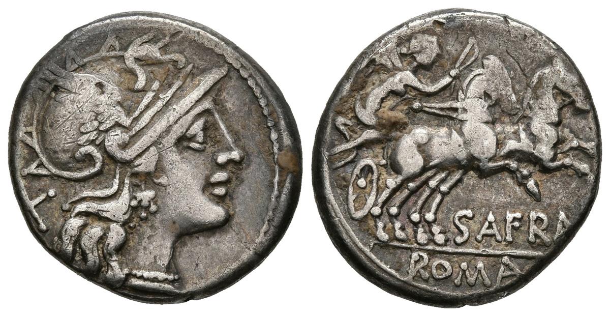 GENS AFRANIA. Denario. (Ar. 3,57g/18mm). 150 a.C. Roma. (FFC 133; Crawford 206/1). Anv: Cabeza de Roma a derecha, detrás X. Rev: Victoria con látigo en biga a derecha, debajo leyenda: SAFRA, en exergo: ROMA. MBC.