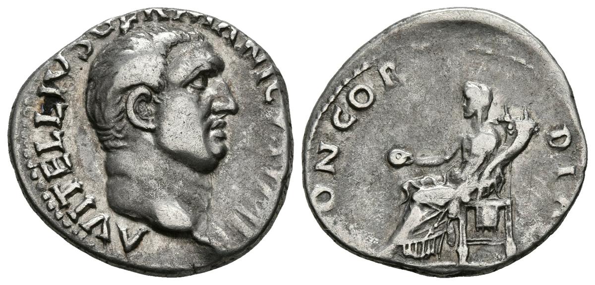 VITELIO. Denario. (Ar. 3,38g/19mm). 69 d.C. Roma. (RIC 66). Anv: Busto de Vitelio a derecha, alrededor leyenda: A VITELLIVS GERMANICVS IMP. Rev: Concordia sentada a derecha portando cornucopia y patera, alrededor leyenda: CONCORDIA P R. MBC.