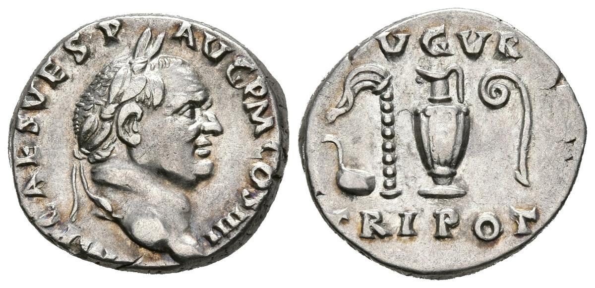 VESPASIANO. Denario. (Ar. 3,29g/17mm). 72-73 d.C. Roma. (RIC 356). Anv: Busto laureado de Galba a derecha, alrededor leyenda: IMP CAES VESP AVG P M COS IIII. Símpulo, aspérgilo, jarra y lítuo, encima leyenda: AVGVR, debajo leyenda: TRI POT. MBC+. Bonito ejemplar.