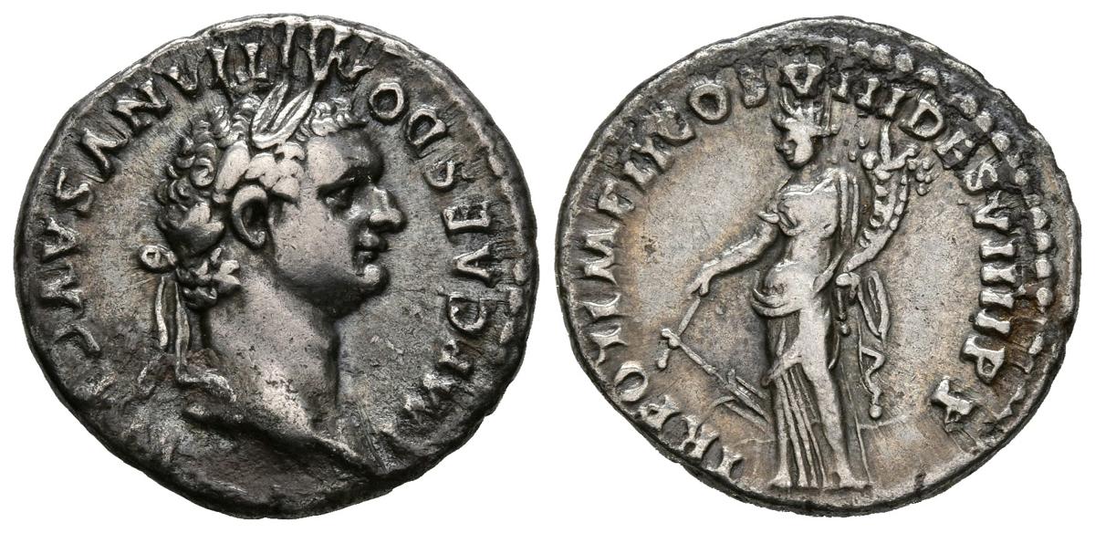 DOMICIANO. Denario. (Ar. 3,46g/19mm). 82 d.C. Roma. (RIC 141). Anv: Busto laureado de Domiciano a derecha, alrededor leyenda: IMP CAES DOMITIANVS AVG P M. Rev: Fortuna estante a izquierda portando timón y cornucopia, alrededor leyenda: TR POT IMP II COS VIII DES VIIII P P. MBC+.