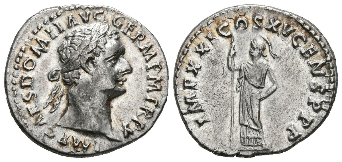 DOMICIANO. Denario. (Ar. 3,31g/19mm). 90-91 d.C. Roma. (RIC 155). Anv: Busto laureado de Domiciano a derecha, alrededor leyenda: IMP CAES DOMIT AVG GERM P M TR P P X. Rev: Minerva estante a izquierda portando cetro, alrededor leyenda: IMP XXI COS XV CENS P P P. EBC. Bonito ejemplar.