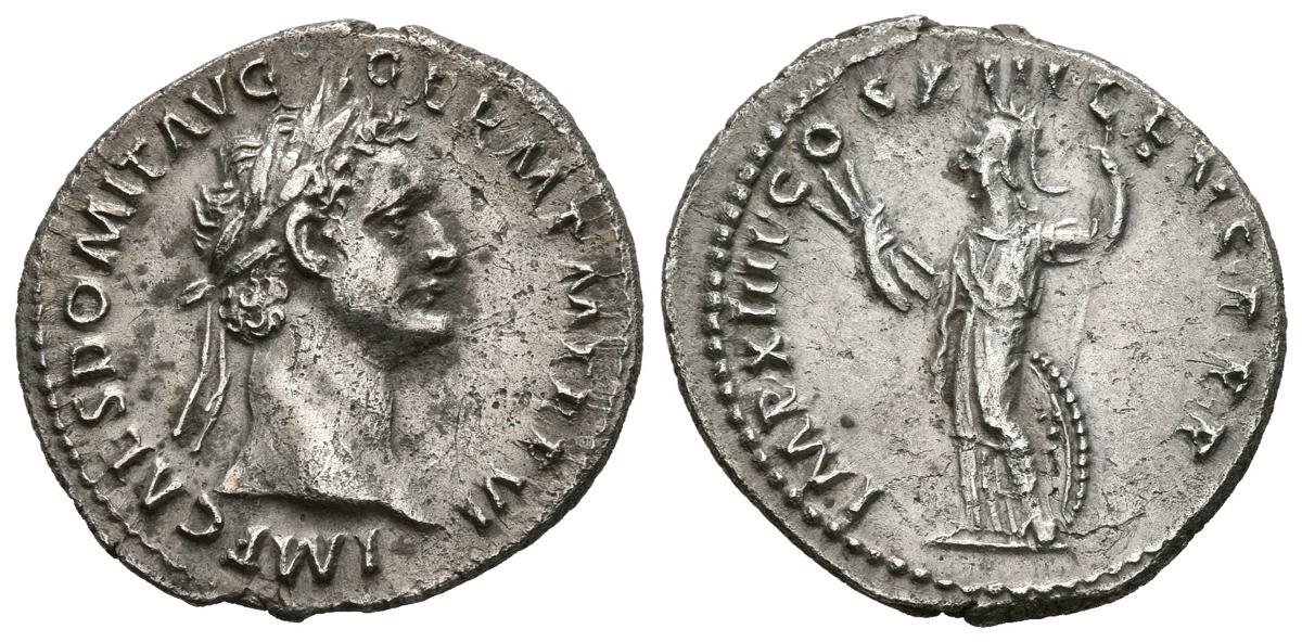 DOMICIANO. Denario. (Ar. 3,25g/20mm). 87-88 d.C. Roma. (RIC 509). Anv: Busto laureado de Domiciano a derecha, alrededor leyenda: IMP CAES DOMIT AVG GERM P M TR P VI. Rev: Minerva estante a izquierda portando rayo y lanza, a sus pies escudo, alrededor leyenda: IMP XIIII COS XIII CENS TR P. EBC-. Bonito ejemplar, escaso así.