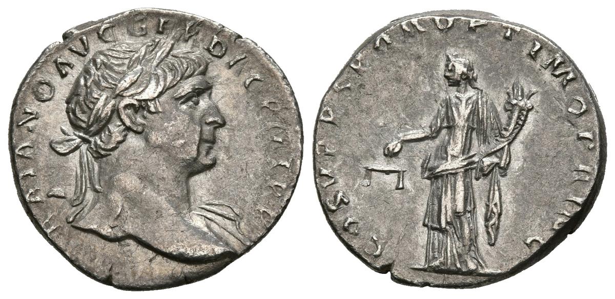 TRAJANO. Denario. (Ar. 2,88g/17mm). 103-111 d.C. Roma. (RIC 118). Anv: Busto laureado de Trajano a derecha con drapeado ligero en hombro izquierdo, alrededor leyenda: IMP TRAIANO AVG GER DAC P M TR P. Rev: Aequitas estante a izquierda portando escalas y cornucopia, alrededor leyenda: COS V P P S P Q R OPTIMO PRINC. MBC+.