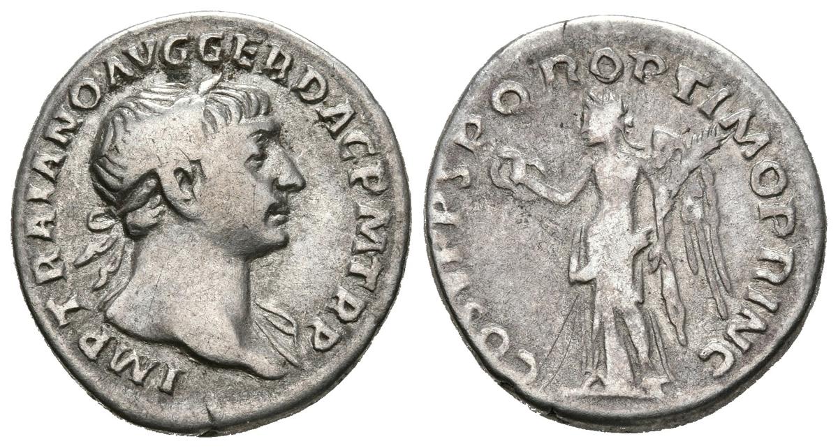 TRAJANO. Denario. (Ar. 3,02g/19mm). 110 d.C. Roma. (RIC 128). Anv: Busto laureado de Trajano a derecha con ligero drapeado en el hombro izquierdo, alrededor leyenda: IMP TRAIANO AVG GER DAC P M TR P. Rev: Victoria estante a izquierda portando corona de laurel y palma, alrededor leyenda: COS V P P S P Q R OPTIMO PRINC. MBC-.