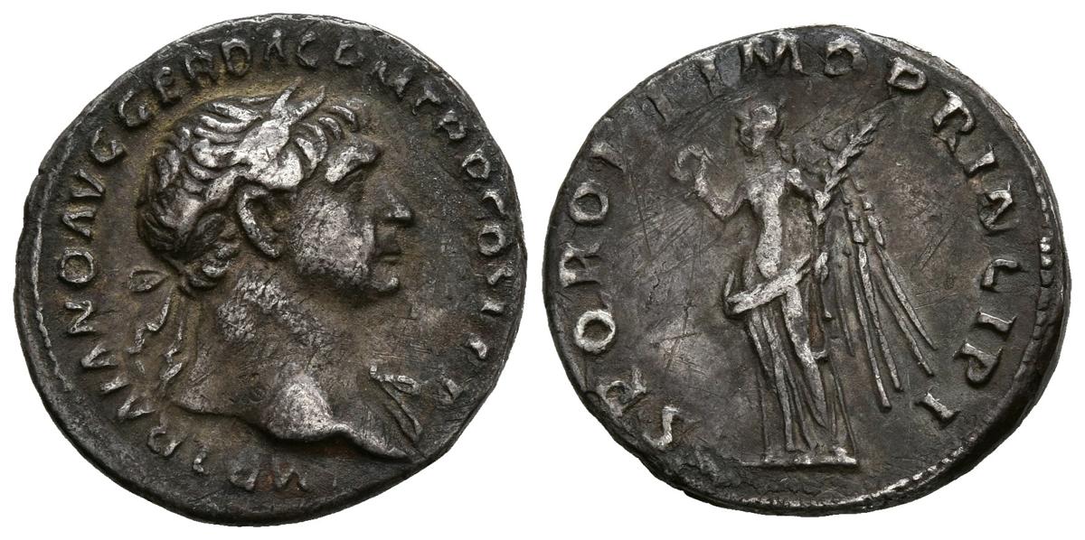TRAJANO. Denario. (Ar. 2,86g/19mm). 107 d.C. Roma. (RIC 193). Anv: Busto laureado de Trajano a derecha con ligero drapeado sobre hombro izquierdo, alrededor leyenda: IMP TRAIANO AVG GER DAC P M TR P COS II P P. Rev: Victoria estante a izquierda portando corona de laurel y palma, alrededor leyenda: S P Q R OPTIMO PRINCIPI. MBC-.