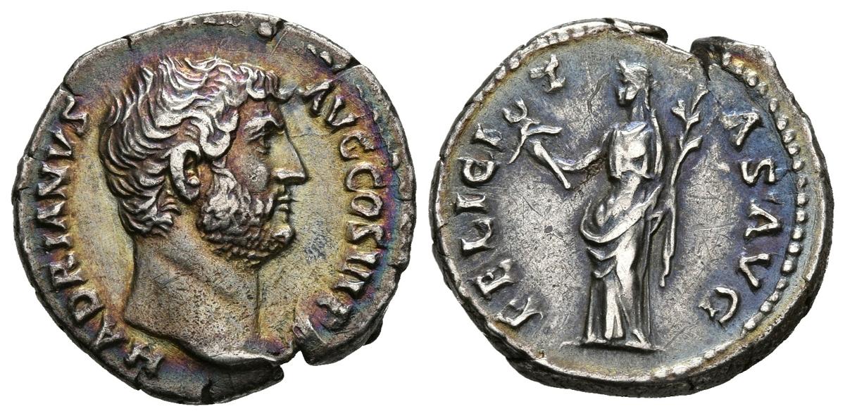 ADRIANO. Denario. (Ar. 3,08g/18mm). 134-138 d.C. Roma. (RIC 234). Anv: Busto de Adriano a derecha, alrededor leyenda: HADRIANVS AVG COS II P P. Rev: Felicitas estante a izquierda portando caduceo y palma, alrededor leyenda: FELICITAS AVG. MBC+. Precioso tono irisado.
