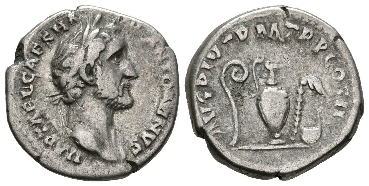ANTONINO PIO. Denario. (Ar. 3,43g/17mm). 139 d.C. Roma. (RIC 28 var). Anv: Busto laureado de Antonino Pío a derecha, alrededor leyenda: IMP T AEL CAES HADR ANTONINVS. Rev: Lítuo, jarra, aspérgilo y símpulo, alrededor leyenda: AVG PIVS P M TR P COS II. MBC.
