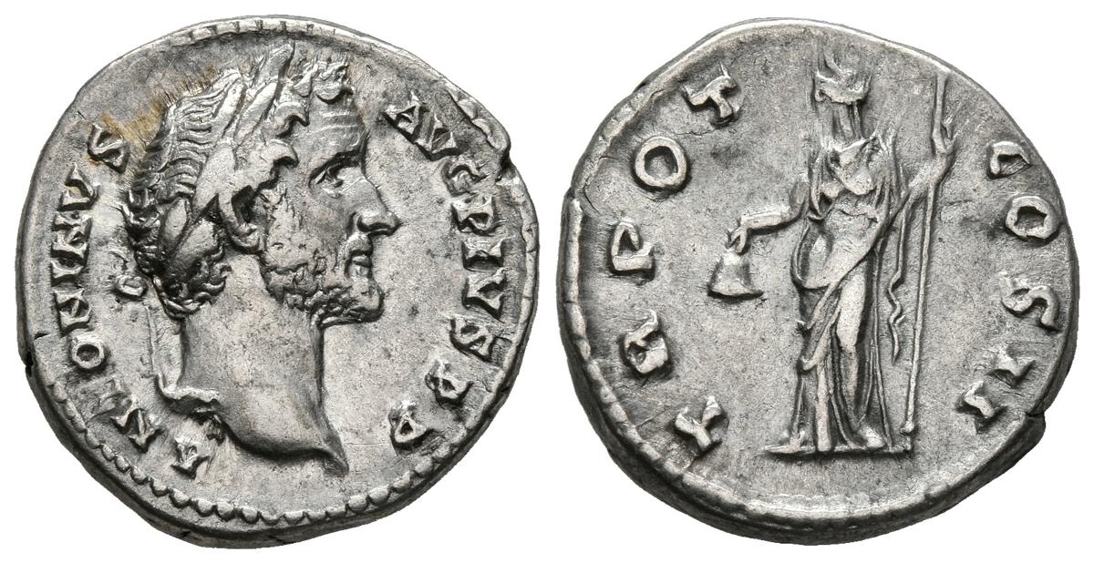 ANTONINO PIO. Denario. (Ar. 3,86g/17mm). 139 d.C. Roma. (RIC 50). Anv: Busto laureado de Antonino Pío a derecha, alrededor leyenda: ANTONINVS AVG PIVS P P. Rev: Libertas estante a izquierda portando píleo y cetro, alrededor leyenda: TR POT COS II. MBC+.