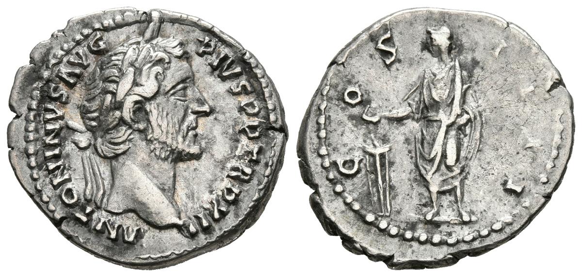 ANTONINO PIO. Denario. (Ar. 3,14g/20mm). 148-149 d.C. Roma. (RIC 183). Anv: Busto laureado de Antonino Pío a derecha, alrededor leyenda: ANTONINVS AVG PIVS P P TR P XII. Rev: Antonino Pío estante a izquierda portando patera sobre trípode, alrededor leyenda: COS IIII. MBC+.