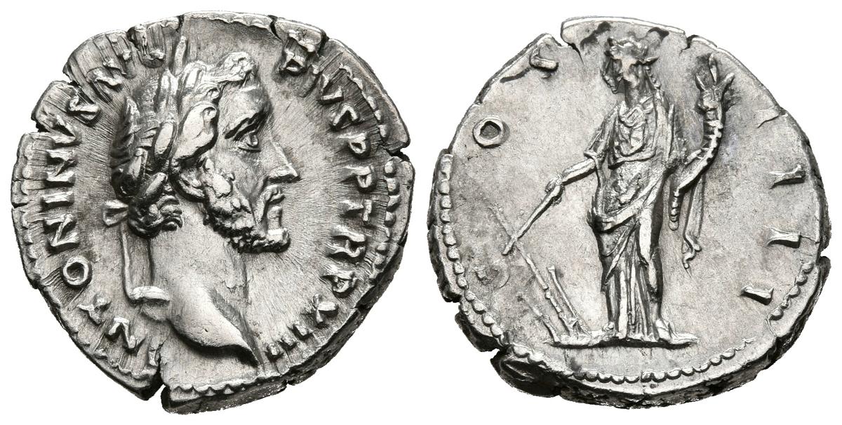 ANTONINO PIO. Denario. (Ar. 3,42g/18mm). 150-151 d.C. Roma. (RIC 194). Anv: Busto laureado de Antonino Pío a derecha, alrededor leyenda: ANTONINVS AVG PIVS P P TR P XIII. Rev: Fortuna estante a izquierda portando timón y cornucopia, alrededor leyenda: COS IIII. EBC-. Bonito ejemplar.