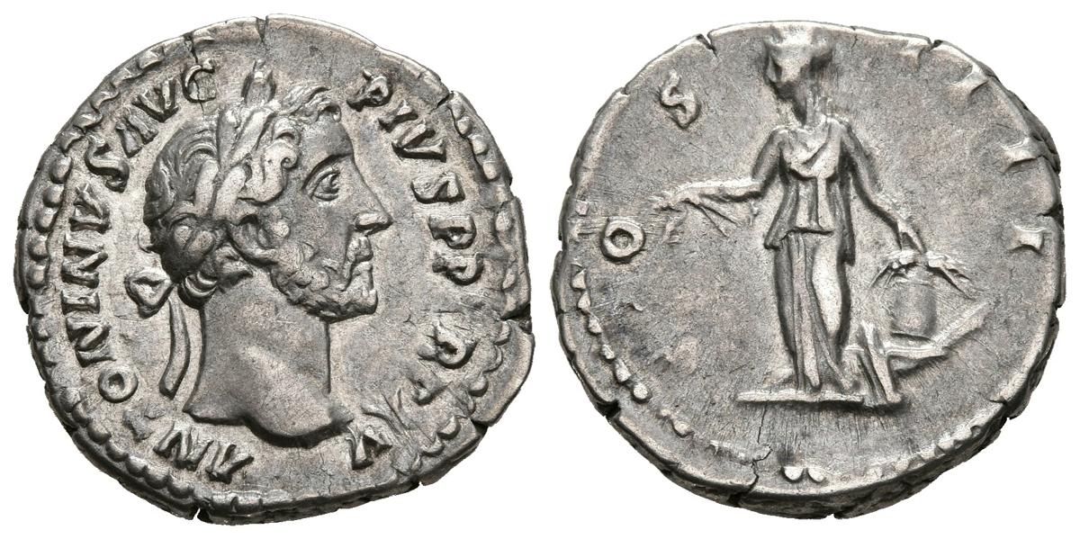 ANTONINO PIO. Denario. (Ar. 3,62g/18mm). 151-152 d.C. Roma. (RIC 204). Anv: Busto laureado de Antonino Pío a derecha, alrededor leyenda: ANTONINVS AVG PIVS P P TR P XV. Rev: Annona estante a izquierda portando espigas, detrás modio sobre proa, alrededor leyenda: COS IIII. MBC+.