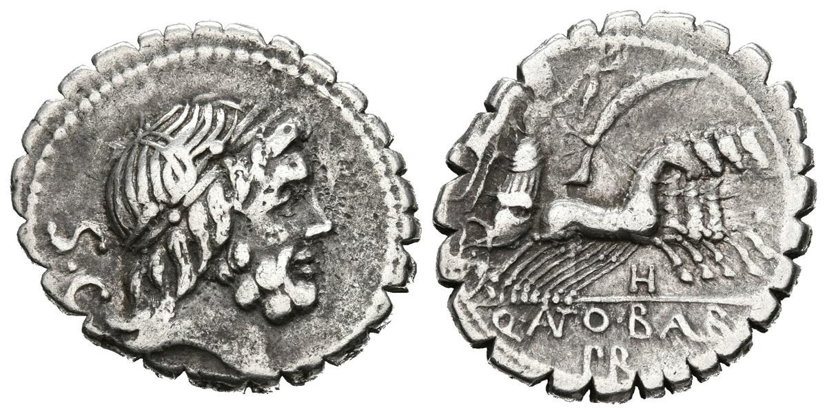 GENS ANTONIA. Denario. (Ar. 3,91g/20mm). 83-82 a.C. Taller auxiliar de Roma. (FFC 156; Crawford 364/1d). Anv: Cabeza laureada de Júpiter a derecha, detras SC. Rev: Victoria en cuádriga a derecha con palma y corona de laurel, debajo letra H, en exergo: Q ANTO BALB PR. MBC.