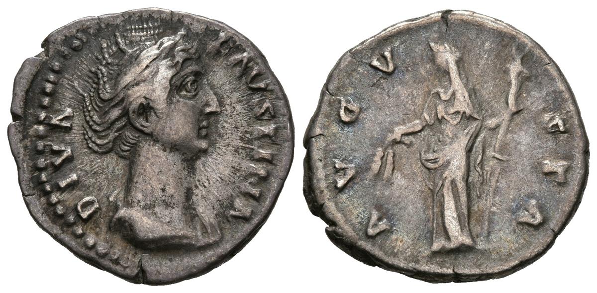 FAUSTINA I. Denario. (Ar. 3,20g/19mm). 141-146 d.C. Roma. (RIC 360). Anv: Busto diademado y drapeado de Faustina I a derecha, alrededor leyenda: DIVA FAVSTINA. Rev: Ceres velado estante a izquierda portando espigas y cetro, alrededor leyenda: AVGVSTA. MBC.