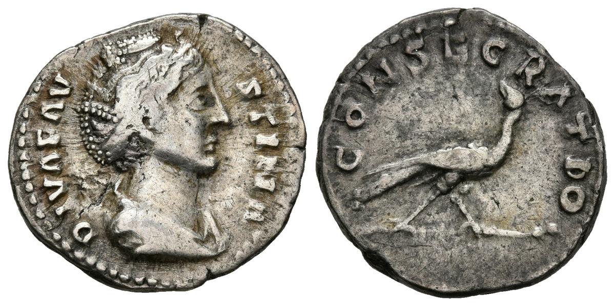FAUSTINA I. Denario. (Ar. 2,97g/18mm). 141 d.C. Roma. (RIC 384). Anv: Busto diademado y drapeado de Faustina I a derecha, alrededor leyenda: DIVA FAVSTINA. Rev: Pavo real avanzando a derecha, alrededor leyenda: CONSECRATIO. MBC-.