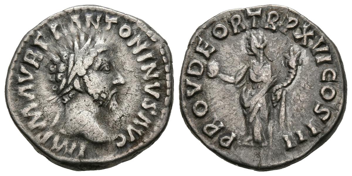 MARCO AURELIO. Denario. (Ar. 3,40g/17mm). 161-162 d.C. Roma. (RIC 51). Anv: Busto laureado de Marco Aurelio a derecha, alrededor leyenda: IPM M AVREL ANTONINVS AVG. Rev: Providentia estante a izquierda portando globo y cornucopia, alrededor leyenda: PROV DEOR TR P XVI COS III. MBC.
