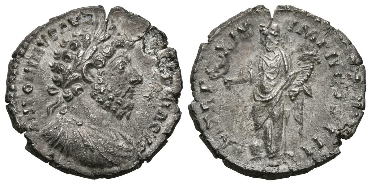 MARCO AURELIO. Denario. (Ar. 2,31g/17mm). 164-165 d.C. Roma. (RIC 132 var). Anv: Busto laureado, drapeado y con coraza de Marco Aurelio a derecha, alrededor leyenda: M ANTONINVS AVG ARMENIACVS. Rev: Felicitas estante a izquierda portando caduceo y cornucopia, alrededor leyenda: P M TR P XIX IMP II COS III. MBC+.
