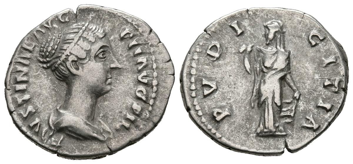 FAUSTINA II. Denario. (Ar. 3,25g/19mm). 147-150 d.C. Roma. (RIC 507). Anv: Busto diademado y drapeado de Faustina II a derecha, alrededor leyenda: FAVSTINAE AVG P II AVG FIL. Rev: Pudicitia estante a izquierda sosteniendo vestido, alrededor leyenda: PVDICITIA. MBC.