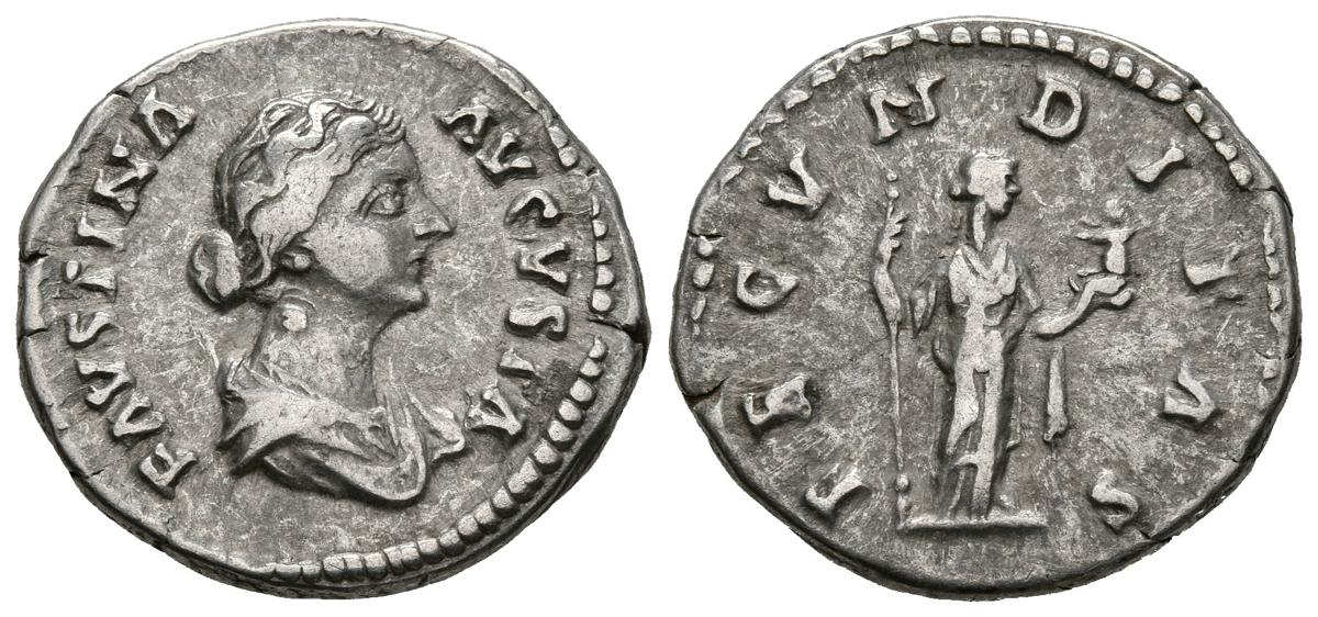 FAUSTINA II. Denario. (Ar. 3,67g/19mm). 161-175 d.C. Roma. (RIC 677). Anv: Busto drapeado de Faustina II a derecha, alrededor leyenda: FAVSTINA AVGVSTA. Rev: Fecunditas estante a derecha portando cetro y niño, alrededor leyenda: FECVNDITAS. MBC.