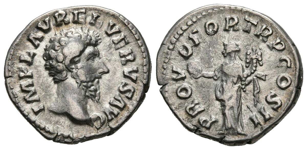 LUCIO VERO. Denario. (Ar. 3,14g/18mm). 161 d.C. Roma. (RIC 463). Anv: Busto de Lucio Vero a derecha, alrededor leyenda: IMP L AVREL VERVS AVG. Rev: Providentia estante a izquierda portando globo y cornucopia, alrededor leyenda: PROV DEOR TR P COS II. MBC.