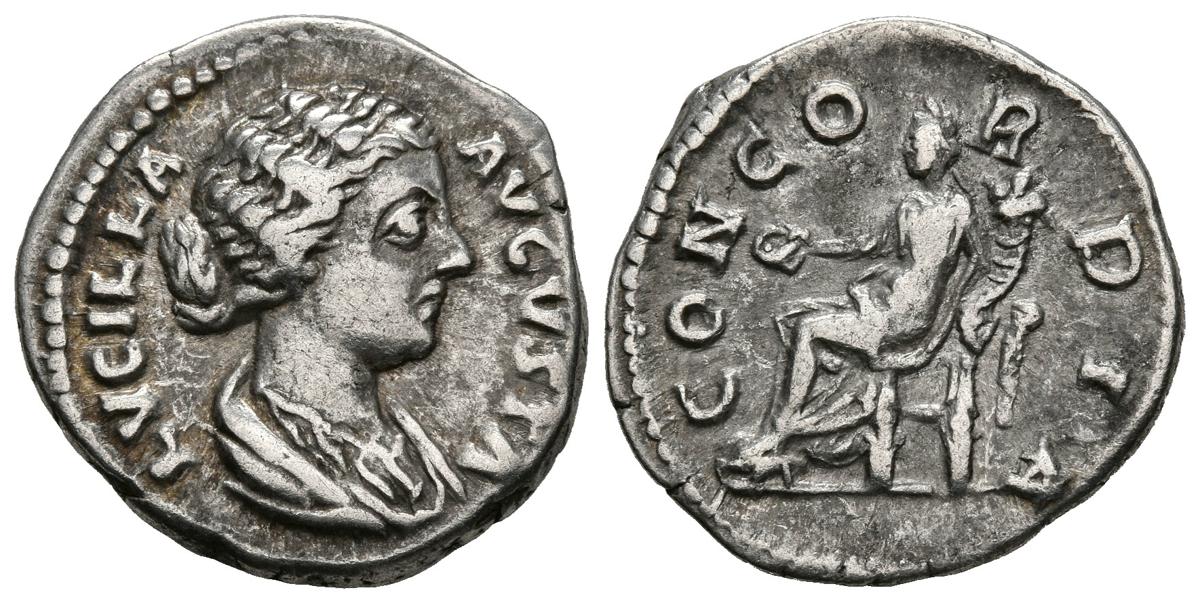 LUCILLA. Denario. (Ar. 3,24g/19mm). 161-162 d.C. Roma. (RIC 758). Anv: Busto drapeado de Lucilla a derecha, alrededor leyenda: LVCILLA AVGVSTA. Rev: Concordia sentada portando patera y cornucopia, alrededor leyenda: CONCORDIA. MBC.