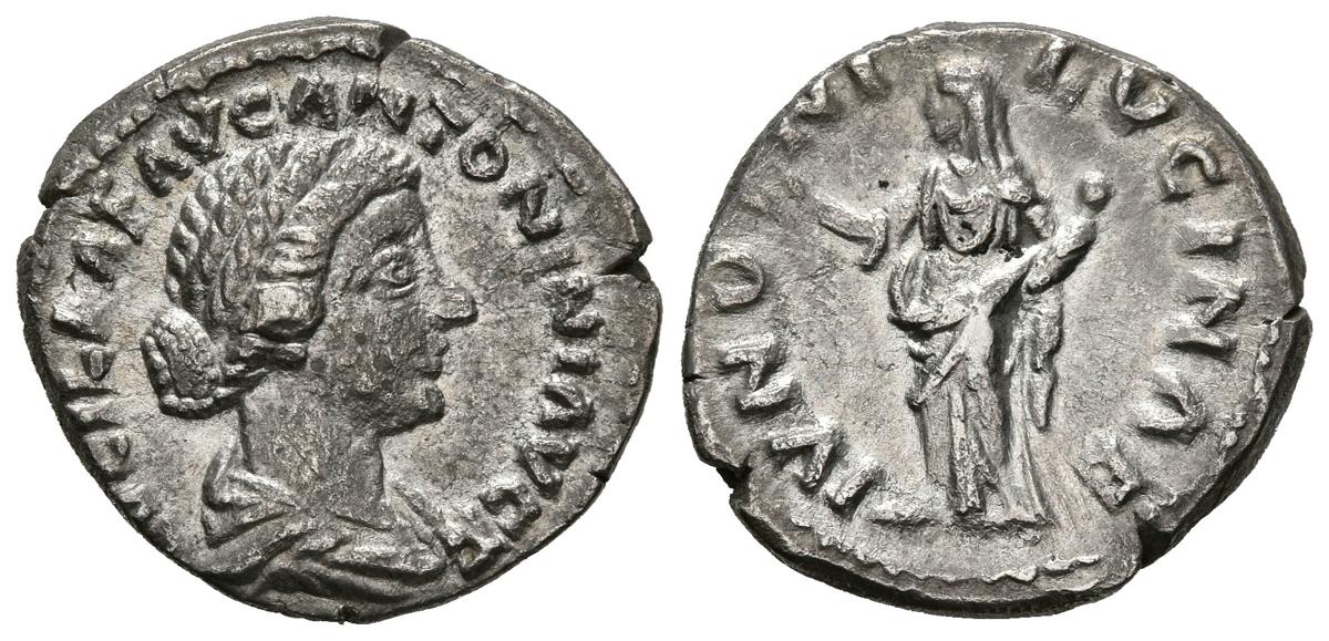 LUCILLA. Denario. (Ar. 3,17g/18mm). 161-162 d.C. Roma. (RIC 771). Anv: Busto drapeado de Lucilla a derecha, alrededor leyenda: LVCILLAE AVG ANTONINI AVG F. Rev: Juno estante a izquierda extendiendo mano y sosteniendo niño, alrededor leyenda: IVNONI LVCINAE. MBC+.
