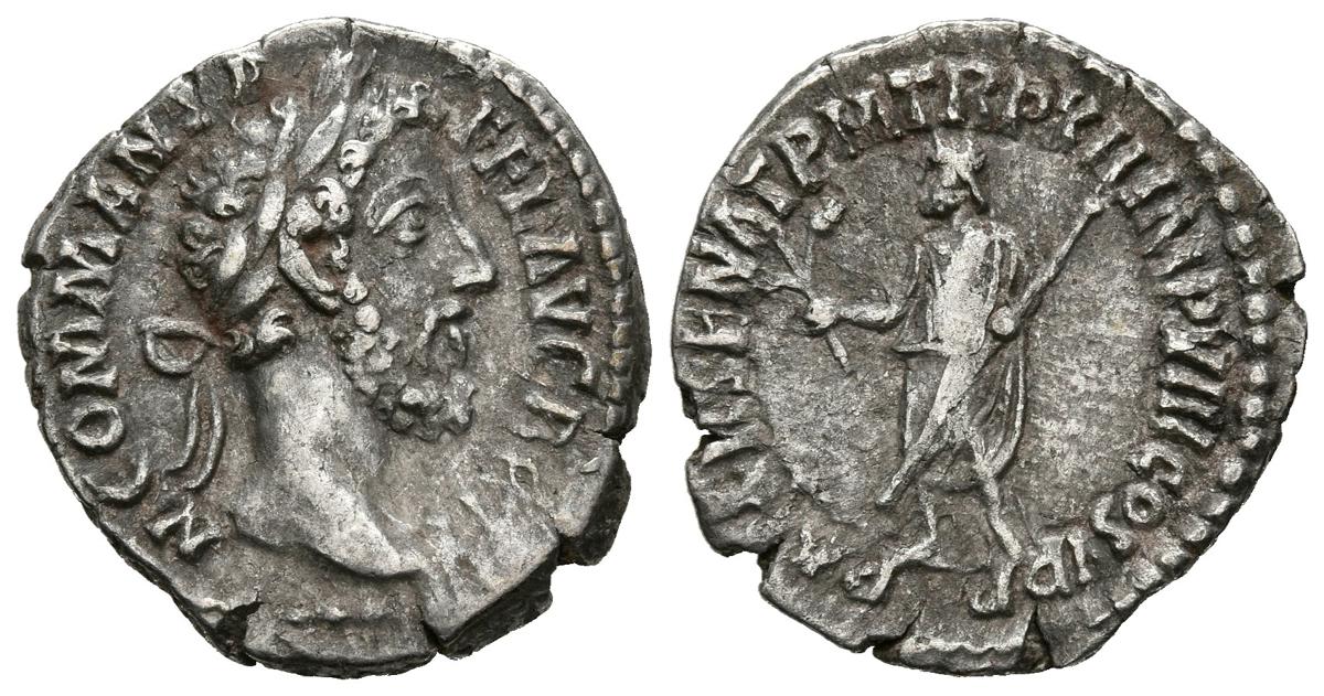 COMODO. Denario. (Ar. 2,59g/19mm). 187 d.C. Roma. (RIC 157). Anv: Busto laureado de Cómodo a derecha, alrededor leyenda: M COMM ANT P FEL AVG BRIT. Rev: Cómodo estante a izquierda portando rama y cetro, alrededor leyenda: PATER SENAT P M TR P XII IMP COS V P P. MBC.