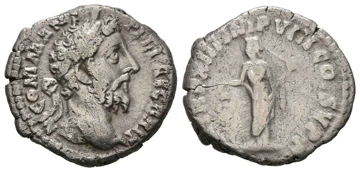 COMODO. Denario. (Ar. 2,72g/18mm). 188 d.C. Roma. (RIC 168). Anv: Busto laureado de Cómodo a derecha, alrededor leyenda: M COMM ANT P FEL AVG BRIT. Rev: Aequitas estante a izquierda portando píleo y cetro sobre la cabeza, alrededor leyenda: P M TR P XIII IMP VIII COS V P P. MBC-.