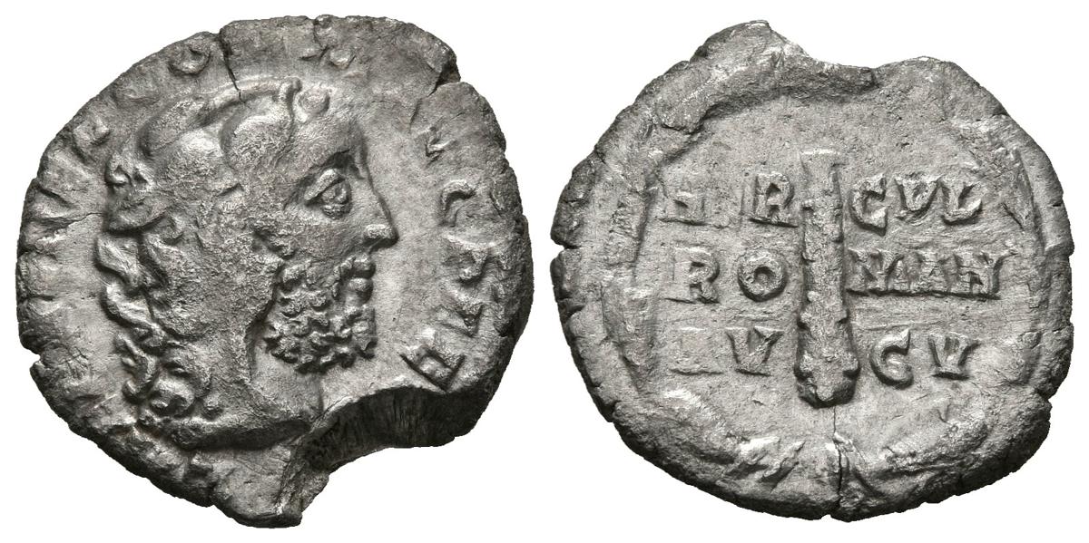 COMODO. Denario. (Ar. 1,96g/17mm). 191-192 d.C. Roma. (RIC 251). Anv: Busto de Cómodo con cabeza de león a derecha, alrededor leyenda: L AEL AVREL COMM AVG P FEL. Rev: Mazo, entre él leyenda en cuatro líneas: HERCVL ROMAN AVGV, todo dentro de láurea. MBC-. Cospel faltado. Escaso.