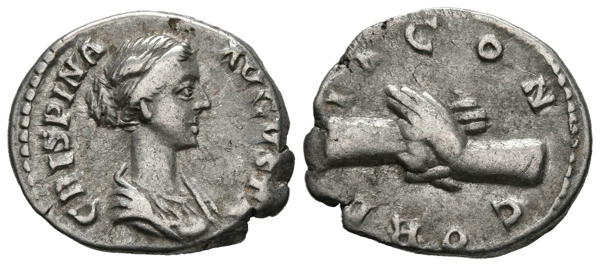 CRISPINA. Denario. (Ar. 2,80g/18mm). 178-192 d.C. Roma. (RIC 279). Anv: Busto drapeado de Crispina a derecha, alrededor leyenda: CRISPINA AVGVSTA. Rev: Manos entrelazadas, alrededor leyenda: CONCORDIA. MBC.