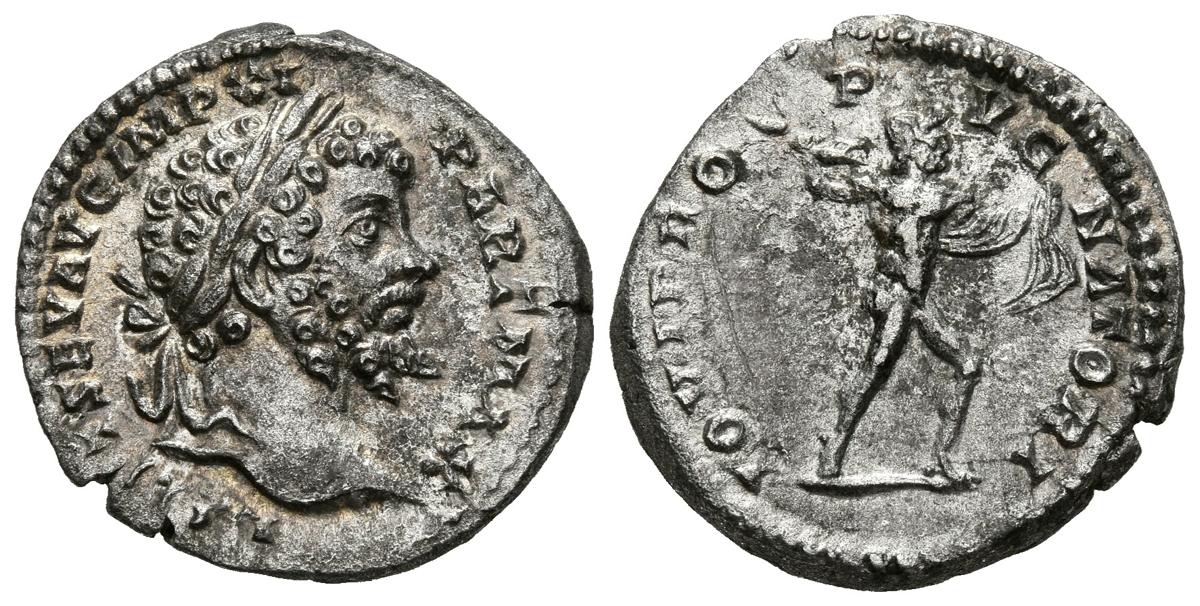 SEPTIMIO SEVERO. Denario. (Ar. 3,23g/19mm). 200-201 d.C. Roma. (RIC 131). Anv: Busto laureado de Septimio Severo a derecha, alrededor leyenda: L SEPT SEV AVG IMP XI PART MAX. Rev: Júpiter avanzando a derecha con rayo y sosteniendo drapeado, alrededor leyenda: IOVI PROPVGNATOR. MBC+. Escaso.