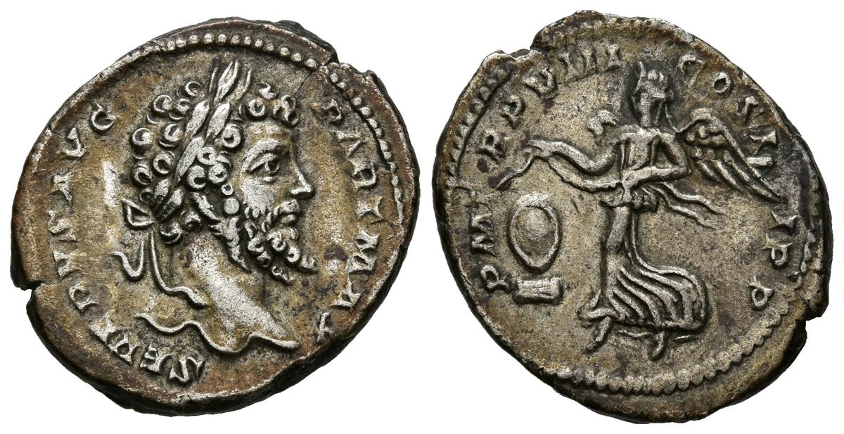 SEPTIMIO SEVERO. Denario. (Ar. 3,37g/20mm). 196 d.C. Roma. (RIC 150). Anv: Busto laureado de Septimio Severo a derecha, alrededor leyenda: SEVERVS AVG PART MAX. Rev: Victoria avanzado a izquierda, delante escudo, alrededor leyenda: P M TR P VIII COS II P P. MBC.