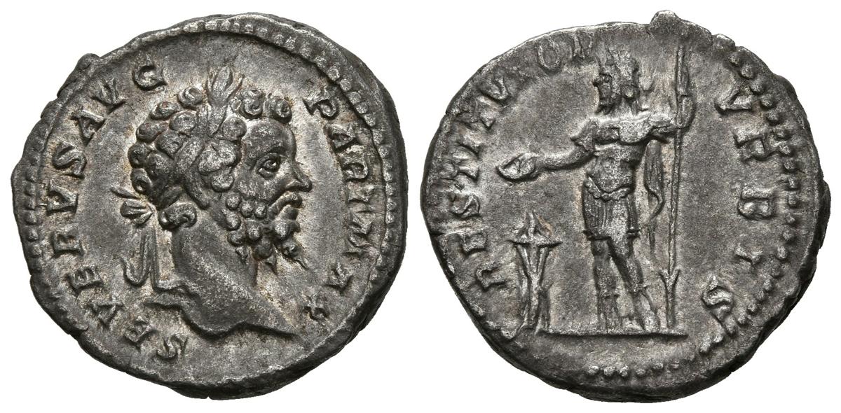 SEPTIMIO SEVERO. Denario. (Ar. 3,20g/19mm). 200-201 d.C. Roma. (RIC 168a). Anv: Busto laureado de Septimio Severo a derecha, alrededor leyenda: SEVERVS AVG PART MAX. Rev: Septimio Severo con uniforme militar con patera sobre trípode y cetro, alrededor leyenda: RESTITVTOR VRBIS. MBC+.