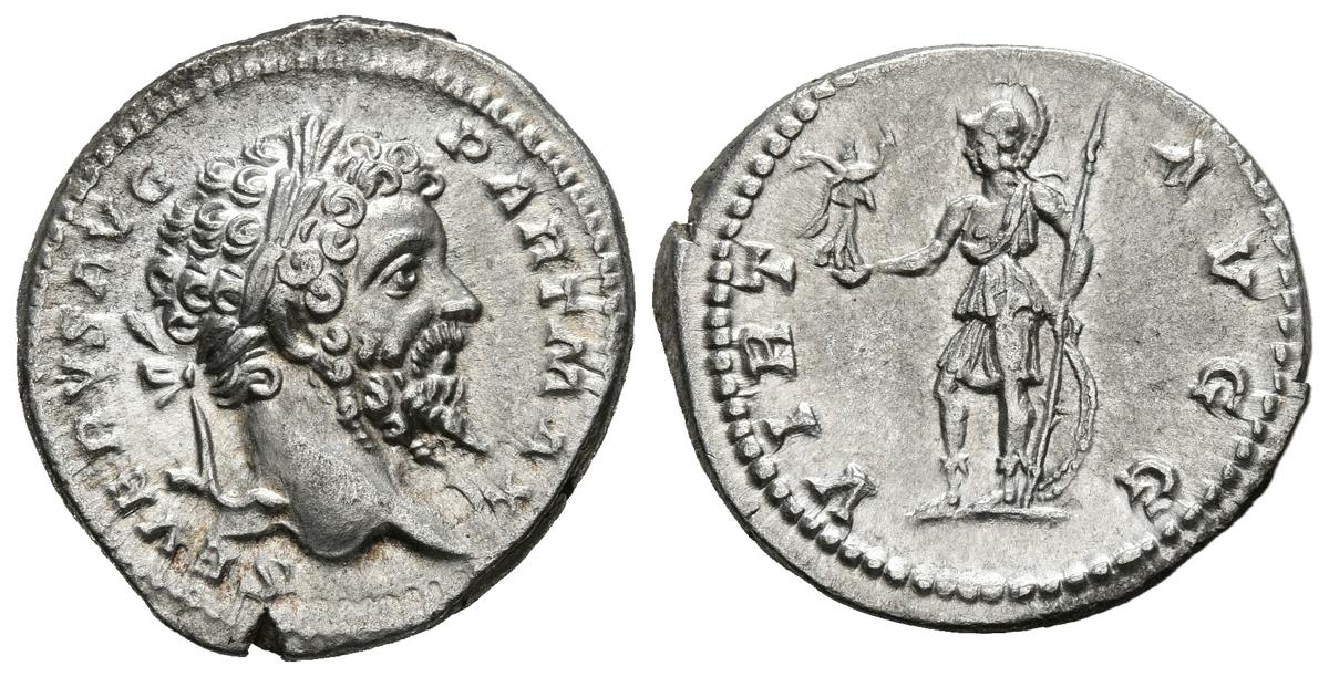 SEPTIMIO SEVERO. Denario. (Ar. 3,42g/20mm). 200-201 d.C. Roma. (RIC 171a). Anv: Busto laureado de Septimio Severo a derecha, alrededor leyenda: SEVERVS AVG PART MAX. Rev: Virtus estante a izquierda portando Victoria y lanza, detrás escudo, alrededor leyenda: VIRT AVGG. EBC-. Bonito ejemplar.