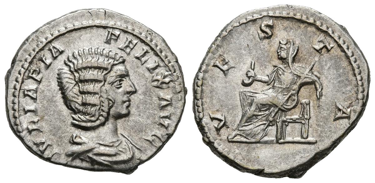 JULIA DOMNA. Denario. (Ar. 3,38g/19mm). 211-215 d.C. Roma. (RIC 391). Anv: Busto drapeado de Julia Domna a derecha, alrededor leyenda: IVLIA PIA FELIX AVG. Rev: Vesta sentada a izquierda portando símpulo y cetro, alrededor leyenda: VESTA. MBC+.