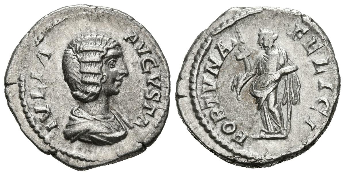 JULIA DOMNA. Denario. (Ar. 3,37g/20mm). 207-211 d.C. Roma. (RIC 552). Anv: Busto drapeado de Julia Domna a derecha, alrededor leyenda: IVLIA AVGVSTA. Rev: Fortuna estante a izquierda portando cornucopia, alrededor leyenda: FORTVNA FELICI. MBC+.
