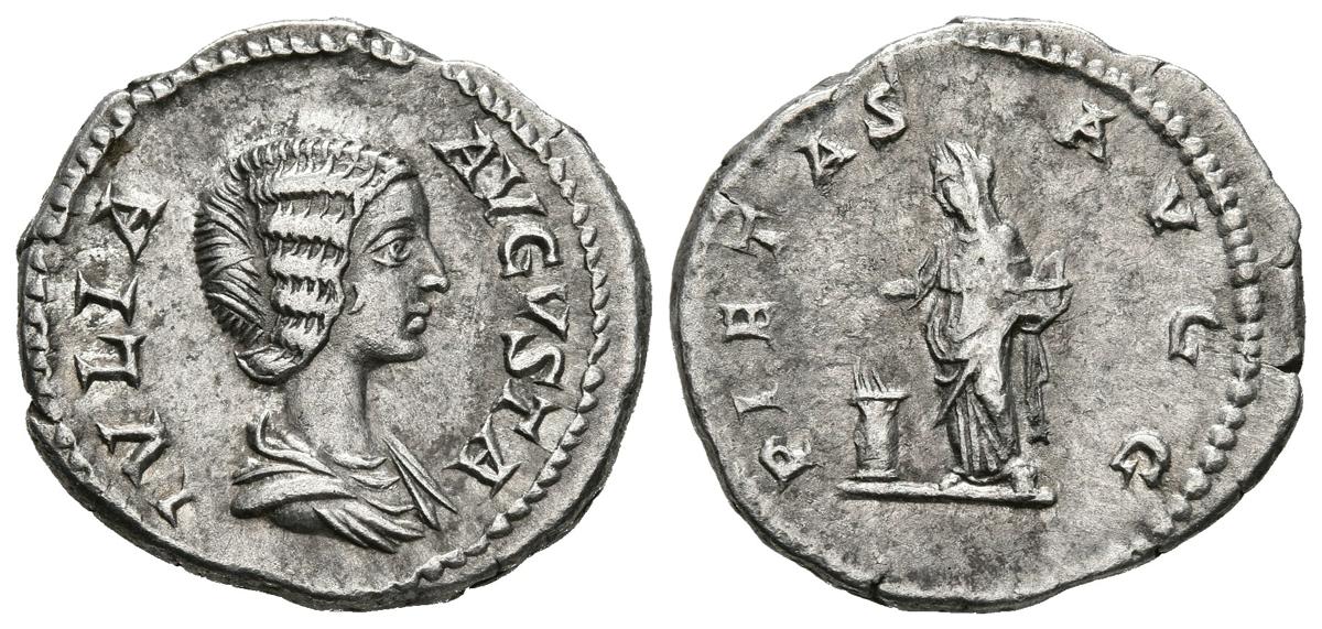 JULIA DOMNA. Denario. (Ar. 3,22g/19mm). 196-211 d.C. Roma. (RIC 572). Anv: Busto drapeado de Julia Domna a derecha, alrededor leyenda: IVLIA AVGVSTA. Rev: Pietas estante a izquierda con patera sobre altar, alrededor leyenda: PIETAS AVGG. MBC.