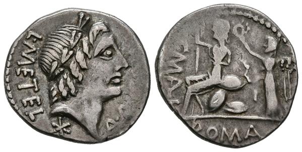 GENS CAECILIA. Denario. (Ar. 3,70g/19mm). 96 a.C. Taller auxiliar de Roma. (FFC 210; Crawford 335/1b). Anv: Cabeza laureada de Apolo a derecha, debajo estrella, alrededor leyenda: L METEL A ABL SF. Rev: Roma con lanza y espada sentada a izquierda sobre escudos coronada por Victoria, a izquierda leyenda: C MALL, en exergo: ROMA. MBC.