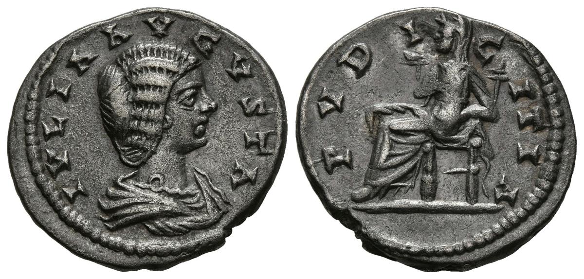 JULIA DOMNA. Denario. (Ar. 2,97g/19mm). 198-202 d.C. Laodicea. (RIC 644). Anv: Busto drapeado de Julia Domna a derecha, alrededor leyenda: IVLIA AVGVSTA. Rev: Pudicitia sentada a izquierda con mano izquierda sobre pecho y derecha en silla, alrededor leyenda: PVDICITIA. MBC+.
