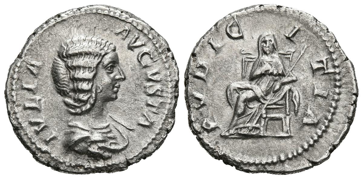 JULIA DOMNA. Denario. (Ar. 3,27g/19mm). 196-211 d.C. Roma. (RIC 644). Anv: Busto drapeado de Julia Domna a derecha, alrededor leyenda: IVLIA AVGVSTA. Rev: Pudicitia sentada a izquierda mirando al frente con mano izquierda sobre pecho y derecha en silla, alrededor leyenda: PVDICITIA. MBC+.