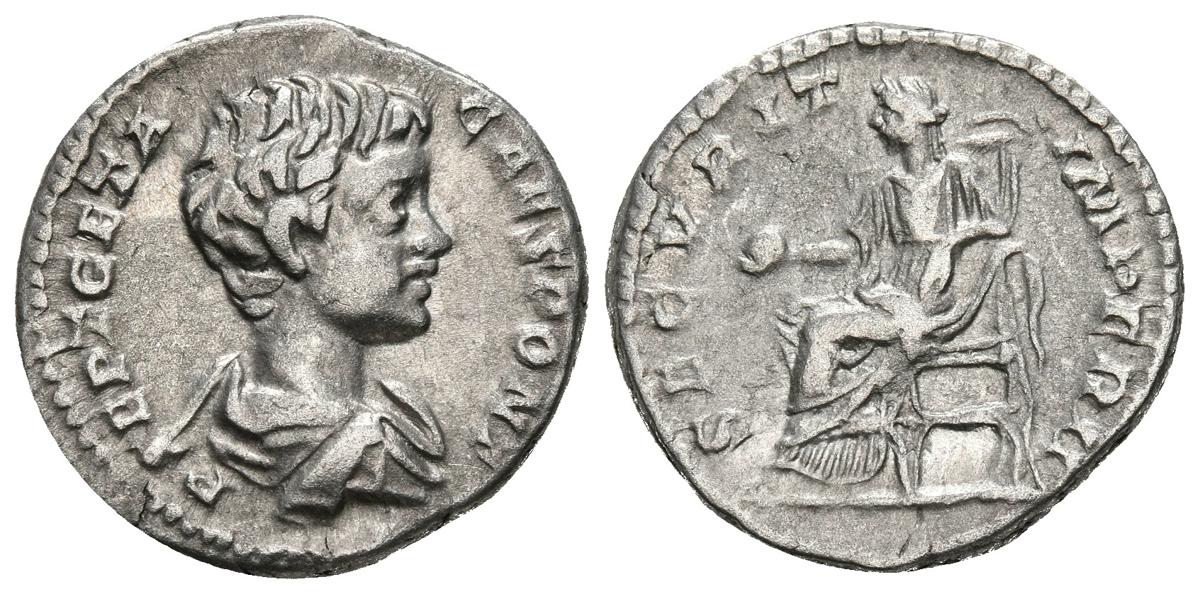 GETA. Denario. (Ar. 3,34g/18mm). 200-205 d.C. Roma. (RIC 20b). Anv: Busto drapeado y con coraza de Geta a derecha, alrededor leyenda: P SEPT GETA CAES PONT. Rev: Securitas sentada a izquierda portando globo, alrededor leyenda: SECURIT IMPERII. MBC.