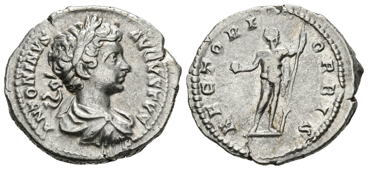 CARACALLA. Denario. (Ar. 3,37g/20mm). 199-200 d.C. Roma. (RIC 40). Anv: Busto laureado y drapeado de Caracalla a derecha, alrededor leyenda: ANTONINVS PIVS AVG. Rev: Sol radiado estante a izquierda sosteniendo globo y lanza, alrededor leyenda: RECTOR ORBIS. MBC+.