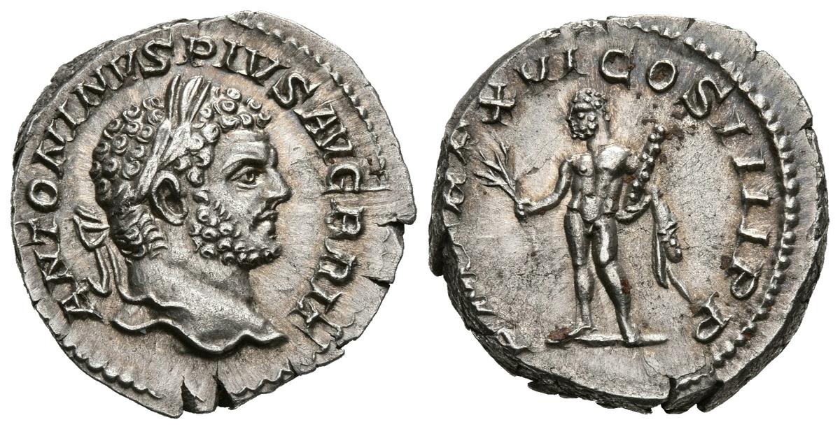 CARACALLA. Denario. (Ar. 3,41g/18mm). 213 d.C. Roma. (RIC 206a). Anv: Busto laureado de Caracalla a derecha, alrededor leyenda: ANTONINVS PIVS AVG BRIT. Rev: Hércules estante a izquierda portando rama y mazo, alrededor leyenda: P M TR P XVI COS IIII P P. EBC. Ligero tono irisado. Precioso ejemplar.