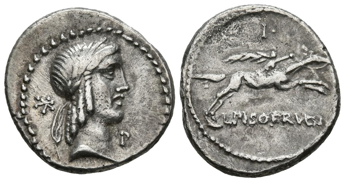 GENS CALPURNIA. Denario. (Ar. 3,90g/19mm). 90-89 a.C. Roma. (FFC 311). Anv: Cabeza laureada de Apolo a derecha, detrás estrella, delante letra: P. Rev: Jinete con palma galopando a derecha, debajo leyenda: L PISO FRVGI, encima letra. MBC+.